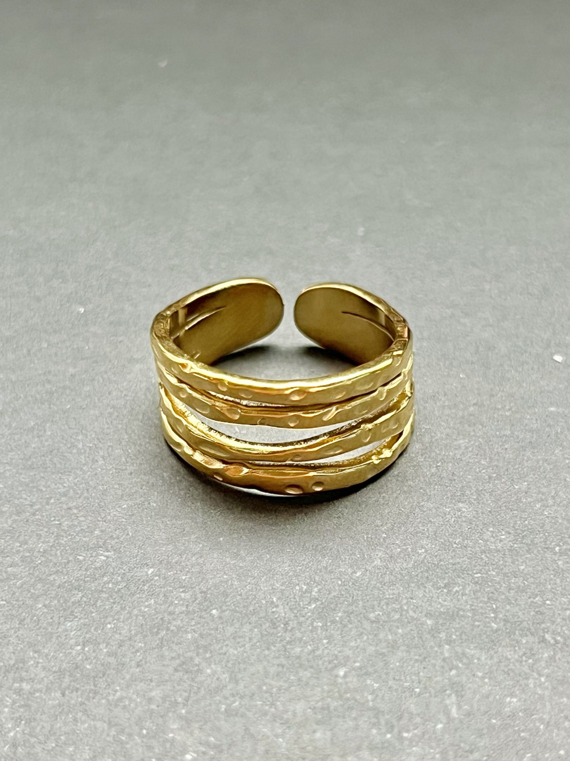 Anel em aço inoxidável com acabamento dourado, composto por várias linhas curvas que criam um efeito elegante e moderno.