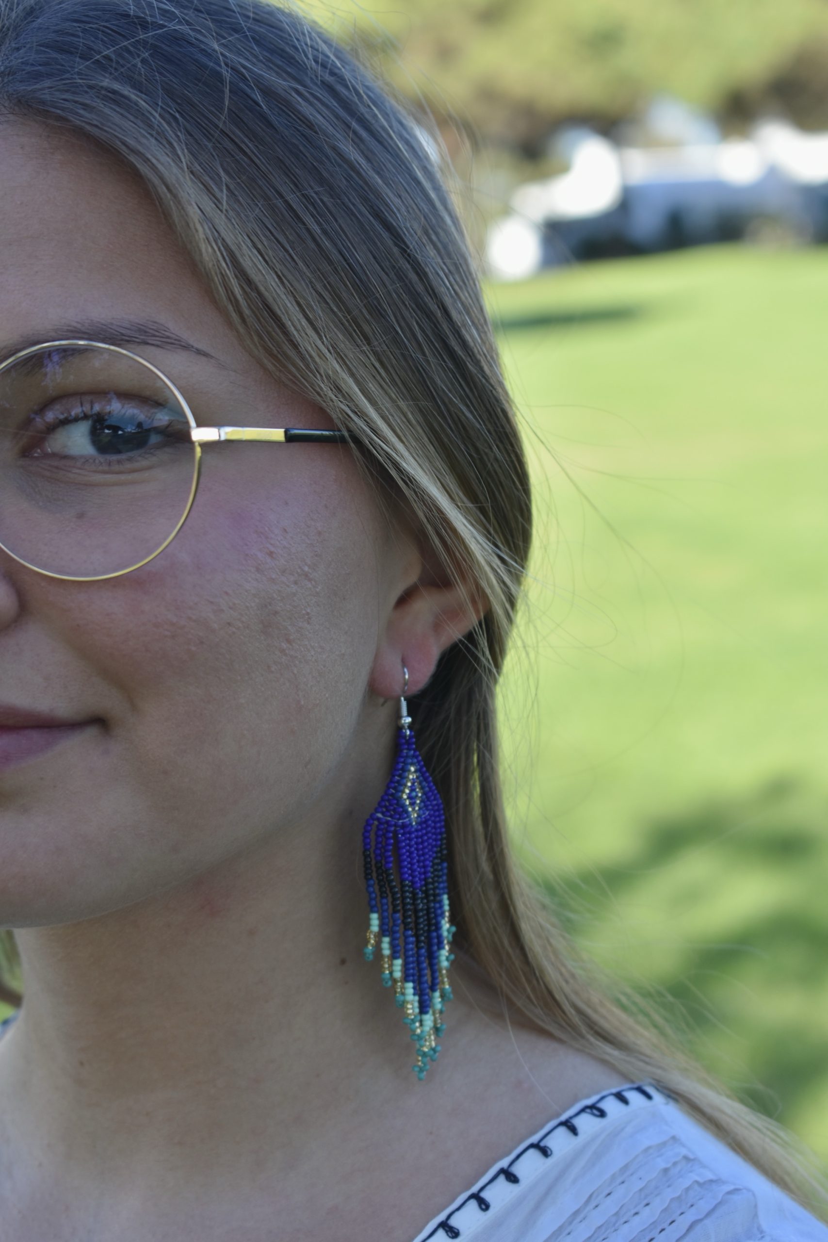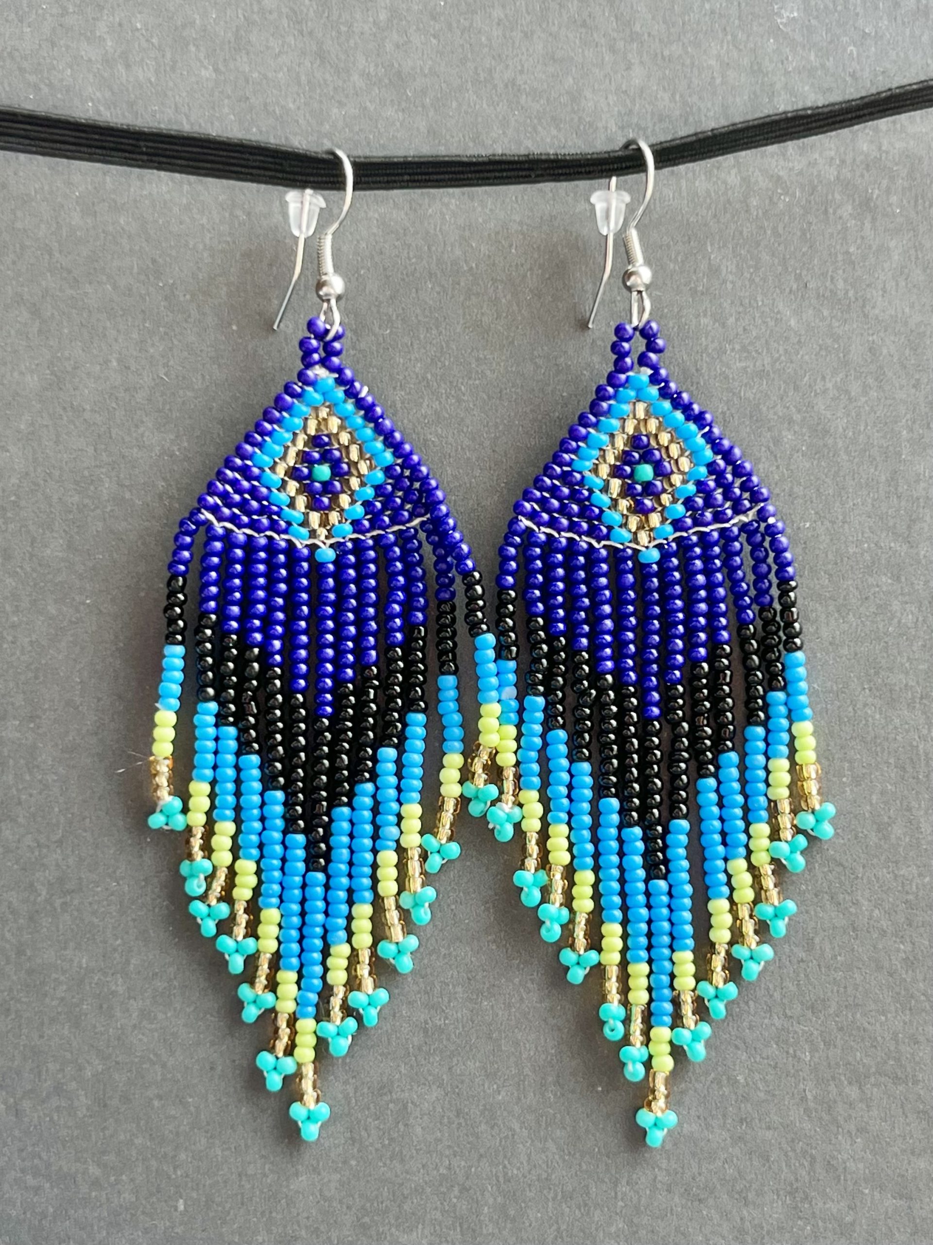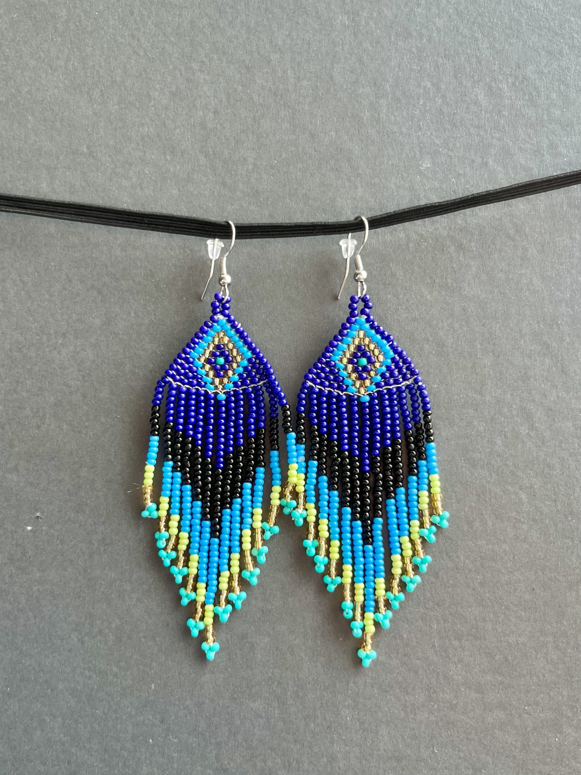 Brincos artesanais com missangas em tons de azul, preto, turquesa e dourado, formando um padrão geométrico marcante e elegante.
