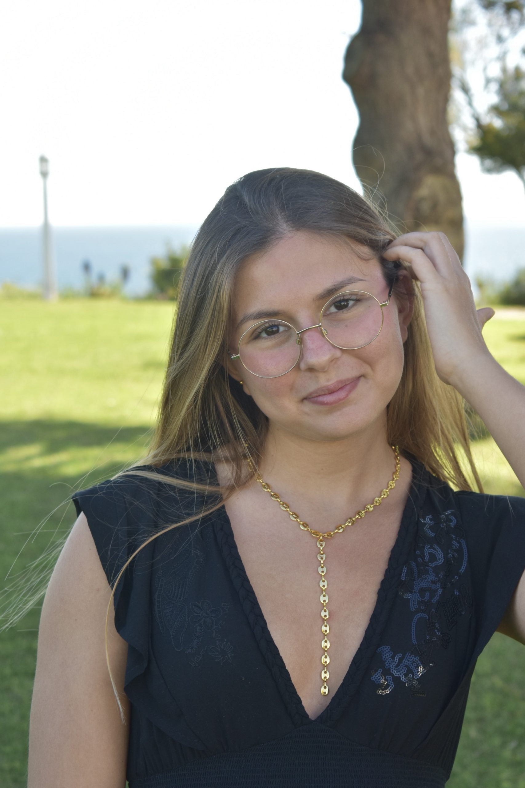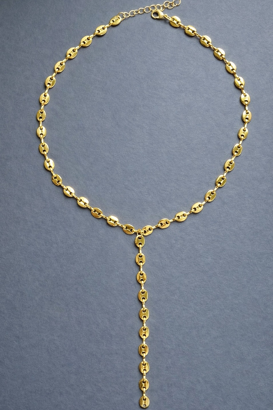 Colar em aço inoxidável com acabamento dourado, com design elegante em formato Y que alonga o pescoço e valoriza o decote.